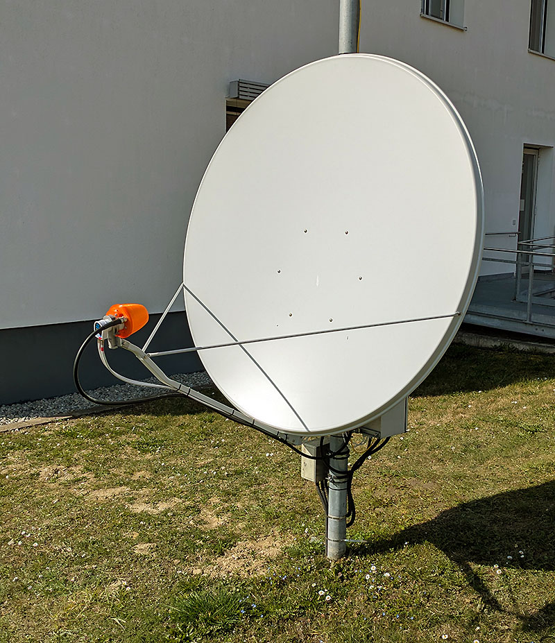 Dieser Offsetparabolspiegel mit 1,5 m Durchmesser soll für den DATV-Uplink (DVB-S2) zum geostationären Amateurfunksatelliten QO100 und gleichzeitig für dessen Empfang auf 10,5 GHz genutzt werden. Daher ist ein passender Erreger notwendig, der den 10-GHZ-LNB nicht zu stark beeinträchtigt.